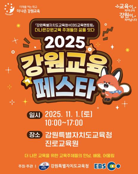 [메이저뉴스]강원특별자치도교육청은 한국교육방송공사(EBS) 디지털교육기획부와 함께 11월 1일 강원특별자치도교육청진로교육원에서 ‘꿈을잇다+ 2025 강원교육페스타’를 개최한다.