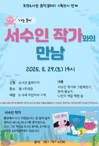 [메이저뉴스]광양희망도서관은 오는 11월 29일 3층 꿈싹갤러리에서 현재 성황리에 운영 중인 기획전시 『그림책이 반짝, 친구가 되는 순간』과 연계해 『나는 문어』의 저자 서수인 작가와의 만남 행사를 진행한다고 밝혔다.