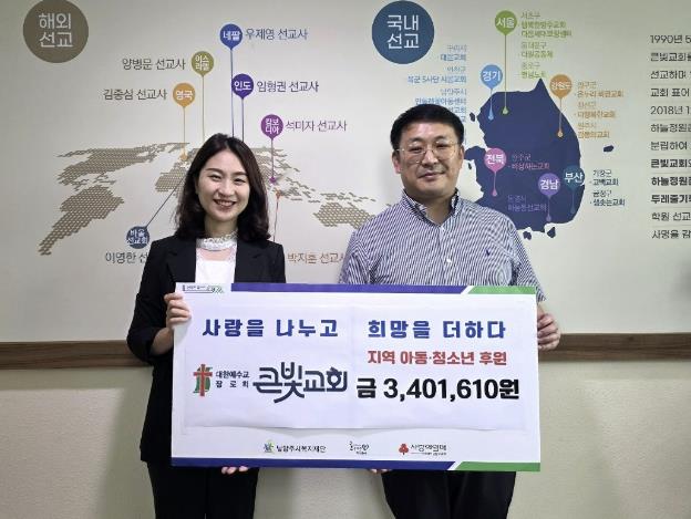 [메이저뉴스]남양주시는 지난 19일 남양주큰빛교회(담임목사 정현수)가 8월 한 달간 ‘사랑의 달’ 캠페인을 통해 모은 후원금 340만 1,610원을 동부희망케어센터에 전달했다고 23일 밝혔다.