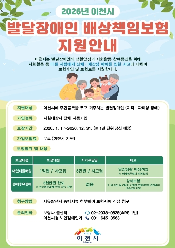 보험금 청구는 사고 발생 시 관련 증빙서류를 첨부해 보험사에 직접 신청하면 되며, 자세한 사항은 보험사 콜센터 또는 이천시청 노인장애인과를 통해 안내받을 수 있다.