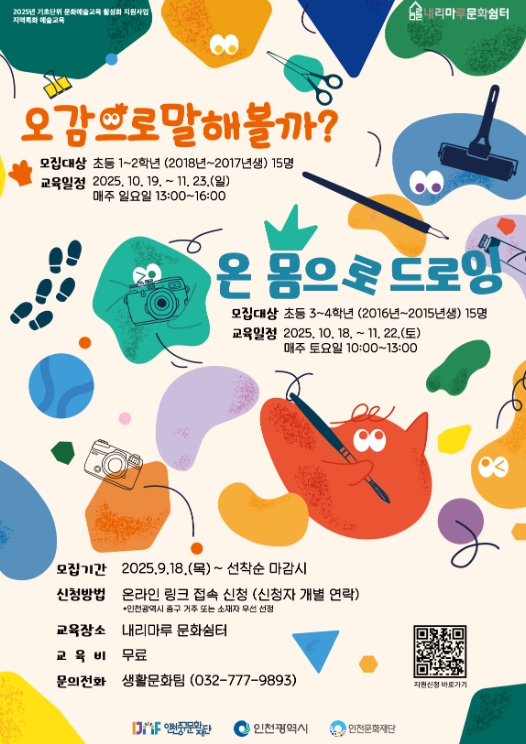 이번 프로그램은 (재)인천중구문화재단이 주최·주관하고, 인천광역시, (재)인천문화재단이 후원하는 ‘2025년 기초단위 문화예술교육 활성화 지원사업’의 일환으로 ▲온 몸으로 드로잉, ▲오감으로 말해볼까? 총 2가지로 구성됐다.