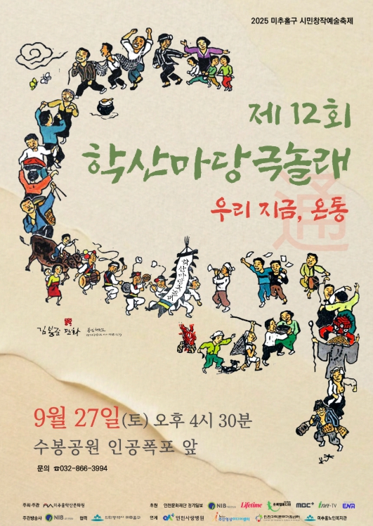 [메이저뉴스]인천 미추홀학산문화원이 주관하는 제12회 미추홀구 시민 창작 예술축제 ‘학산마당극 놀래’가 오는 27일 오후 4시 30분, 수봉공원 인공폭포 마당에서 개최된다.