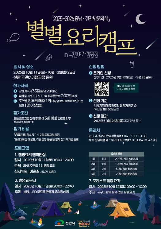 시는 ‘2025~2026 천안 방문의 해’를 맞아 외부 관광객 유치를 위해 다음 달 11일부터 12일까지 1박 2일간 천안국민여가캠핑장에서 별별 요리 캠프를 진행한다.