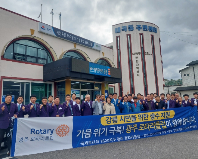 [메이저뉴스]국제로타리3600지구 광주로타리클럽(회장 김영근)은 19일 가뭄으로 힘든 시간을 보내고 있는 강릉 내곡동 주민들을 위한 생수(500㎖) 9,600병을 내곡동주민센터에 전달했다.