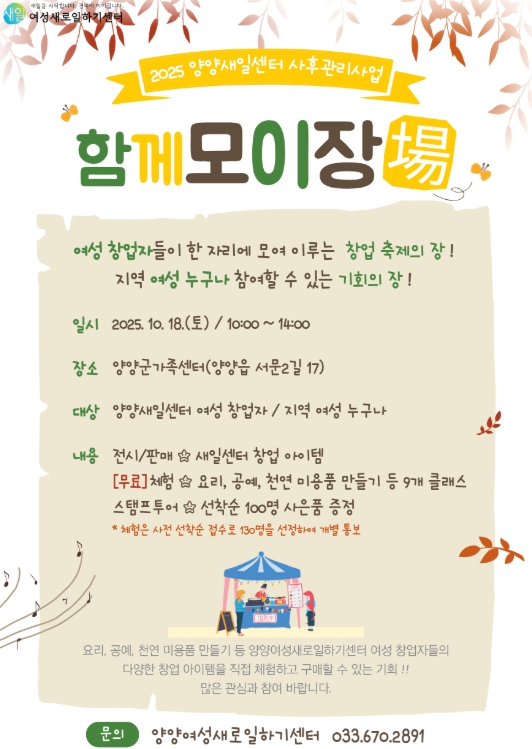 이번 행사는 양양새일센터의 사후관리사업 일환으로 마련됐으며, 지역 여성 창업자와 지역민이 함께 어울려 체험·판매·소통이 어우러지는 축제의 장이 될 예정이다.