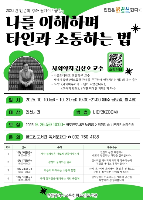 [메이저뉴스]인천광역시교육청화도진도서관은 10월 10일부터 31일까지 매주 금요일 4회에 걸쳐 인문학 강좌 ‘나를 이해하며 타인과 소통하는 법’을 운영한다.