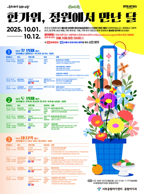 '보라매 풍성한 즐거움 가족 가드닝'은 보라매공원 정원문화센터에서 가족과 함께 가을 연상 국화 등 풍성한 한가위를 닮은 꽃바구니를 만들어보는 가드닝 체험 프로그램으로 10월 3일~4일 동안 운영한다.(참가비: 5,000원, 온라인 선착순 접수, 가족·팀 단위 모집)
