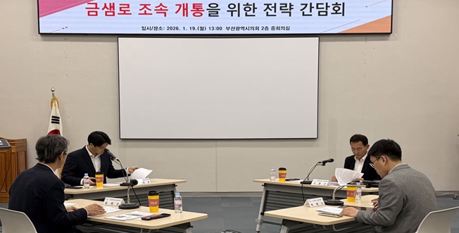 [메이저뉴스]부산광역시의회 이준호.이종진 의원은 1월 19일 오후 1시, 시의회 중회의실에서 '금샘로 조속 개통을 위한 전략 간담회'를 개최했다. 이번 간담회는 산성터널 접속도로 미개설 구간인 금샘로 공사의 지연 원인을 점검하고, 조속한 사업 추진을 위한 실질적인 해결 방안을 모색하기 위해 마련됐다.