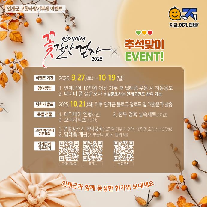 [메이저뉴스]인제군이 ‘2025 인제 가을꽃축제’와 추석명절을 맞아 ‘고향사랑기부제 특별 이벤트’를 오는 27일부터 다음 달 19일까지 진행한다.
