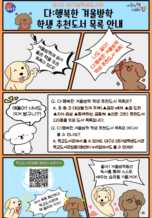 [메이저뉴스]대구2·28기념학생도서관은 겨울방학을 맞아 학생들이 독서를 통해 정서적 성장과 사고력 신장을 도모할 수 있도록 학생 맞춤형 추천도서 목록인 ‘다:행복한 겨울방학 학생 추천도서 목록’을 배포한다.