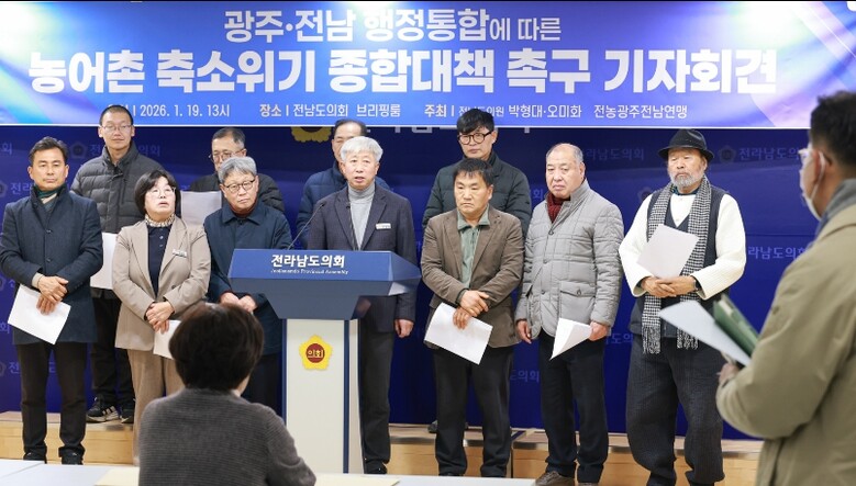 [메이저뉴스]전라남도의회 박형대 의원(진보당·장흥1)은 1월 19일 도의회 브리핑룸에서 기자회견을 열고 “광주ㆍ전남 행정통합 논의가 속도를 내고 있지만 농어촌 축소 위기에 대한 대비는 현저히 부족하다”며 농어촌 보호를 위한 구체적 합의를 요구했다.