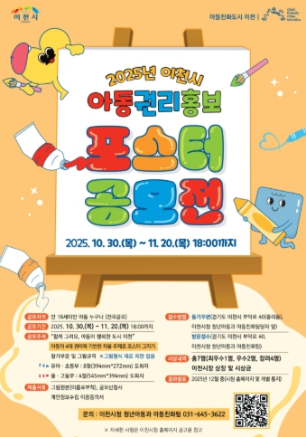 [메이저뉴스]이천시는 10월 30일부터 11월 20일까지 아동권리에 대한 인식 확산을 위해 ‘2025년 이천시 아동권리 홍보 포스터 그리기 공모전’을 실시한다고 밝혔다.