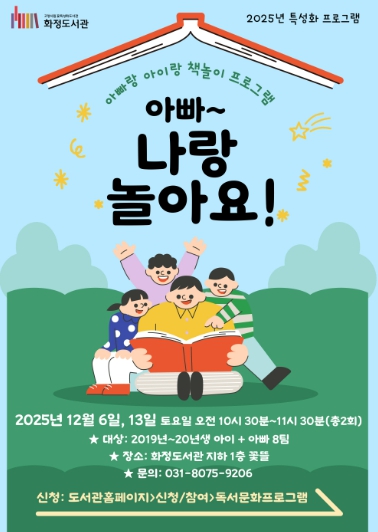 [메이저뉴스]고양특례시 화정도서관은 오는 12월 6일, 13일 오전 10시 30분, 화정도서관 지하 1층 꽃뜰에서 특성화 프로그램 ‘아빠~ 나랑 놀아요!'를 운영한다.