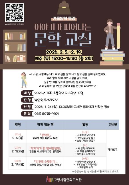 [메이저뉴스]고양특례시 한뫼도서관은 겨울방학을 맞아 초등학교 고학년을 대상으로 한 특강‘이야기가 피어나는 문학 교실’을 운영한다.