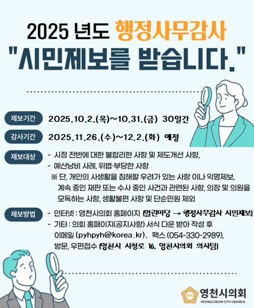 [메이저뉴스]영천시의회는 2025년도 행정사무감사를 앞두고 10월 31일까지 시민제보를 받는다.
