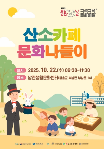 [메이저뉴스](재)청송문화관광재단은 오는 10월 22일과 11월 25일 청송군 부남면 남관생활문화센터에서 2025 문화가 있는 날 '구석구석 문화배달' 사업의 일환으로 ‘산소카페 문화나들이’ 행사를 개최한다.