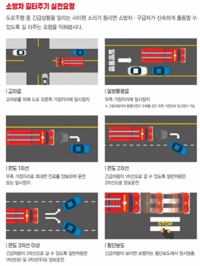 소방서는 도로 주행 중 긴급차량의 사이렌이 들릴 경우, 운전자가 즉시 도로 가장자리로 이동하거나 일시 정지해야 한다며 교차로, 일방통행로, 편도 도로 등 상황별 올바른 대처 요령을 안내했다.