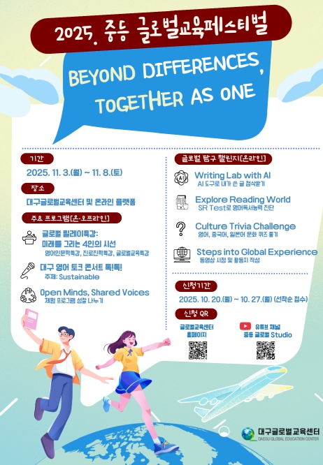 [메이저뉴스]대구교육연수원 산하 대구글로벌교육센터는 11월 3일부터 8일까지 ‘Beyond Differences, Together as One(차이를 넘어, 하나로)’을 주제로 '2025 중등 글로벌교육페스티벌'을 개최한다.