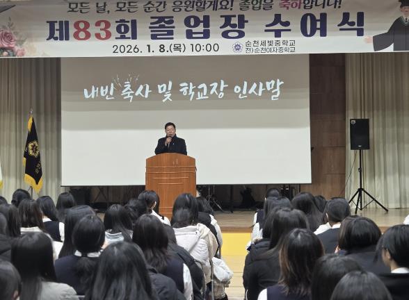 [메이저뉴스]김정희 전남도의회 교육위원장은 1월 8일, 순천세빛중학교에서 열린 제83회 졸업식에 참석해 졸업생들의 새로운 출발을 축하하고, 전남교육의 미래를 향한 따뜻한 격려의 메시지를 전했다.
