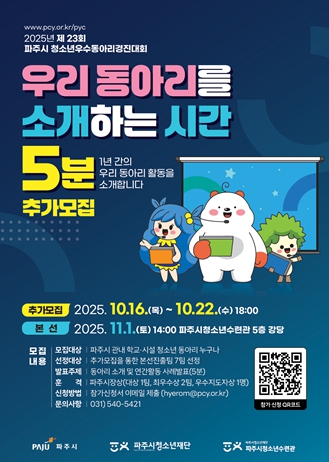 [메이저뉴스](재)파주시청소년재단 파주시청소년수련관은 오는 10월 16일부터 10월 22일까지 “제23회 파주시 청소년우수동아리경진대회”의 참가 동아리를 모집한다.