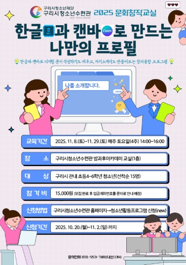 [메이저뉴스]구리시청소년재단 청소년수련관은 청소년들의 디지털 문해력 향상과 자기 표현력 강화를 위한 실습형 프로그램 '한글과 캔바로 만드는 나만의 프로필'의 참가자를 10월 20일부터 11월 2일까지 수련관 홈페이지에서 선착순 모집한다고 밝혔다.