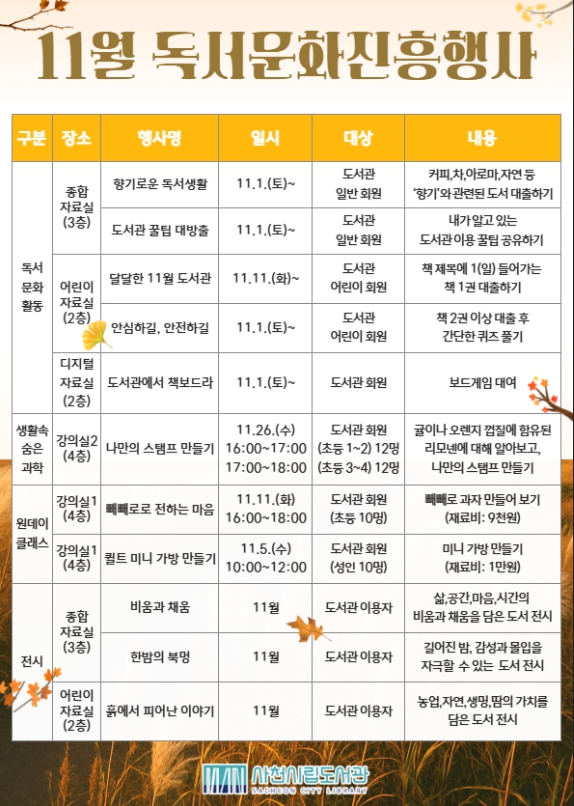 [메이저뉴스]사천시는 사천시립도서관에서 11월 한 달 동안 책과 함께 여유로운 시간을 보내며 감성을 채울 수 있는 다양한 독서문화행사와 체험 프로그램을 운영한다고 17일 밝혔다.