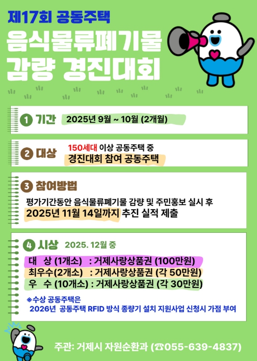 [메이저뉴스]거제시는 관내 150세대 이상 공동주택을 대상으로 음식물류 폐기물 감량 경진대회를 개최한다고 밝혔다.