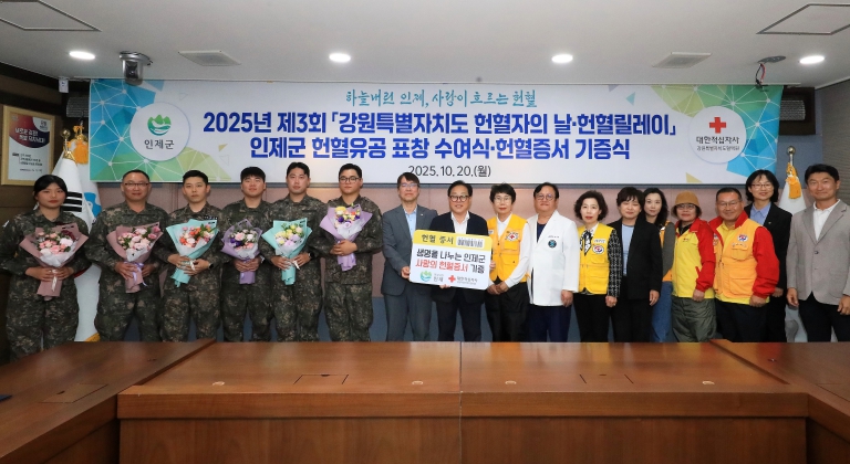[메이저뉴스]인제군은 ‘2025 헌혈자의 날’을 기념해 지난 10월 20일 인제군청 소회의실에서 헌혈유공자 12명에게 인제군수 표창을 수여하고, 헌혈증서 1,000매를 강원혈액원에 기부했다고 밝혔다.