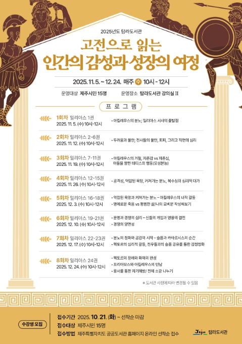 [메이저뉴스]제주시 탐라도서관은 고대 그리스 서사시 ‘일리아스’를 활용한 ‘고전으로 읽는 인간의 감성과 성장의 여정’ 프로그램 참여자를 모집한다.