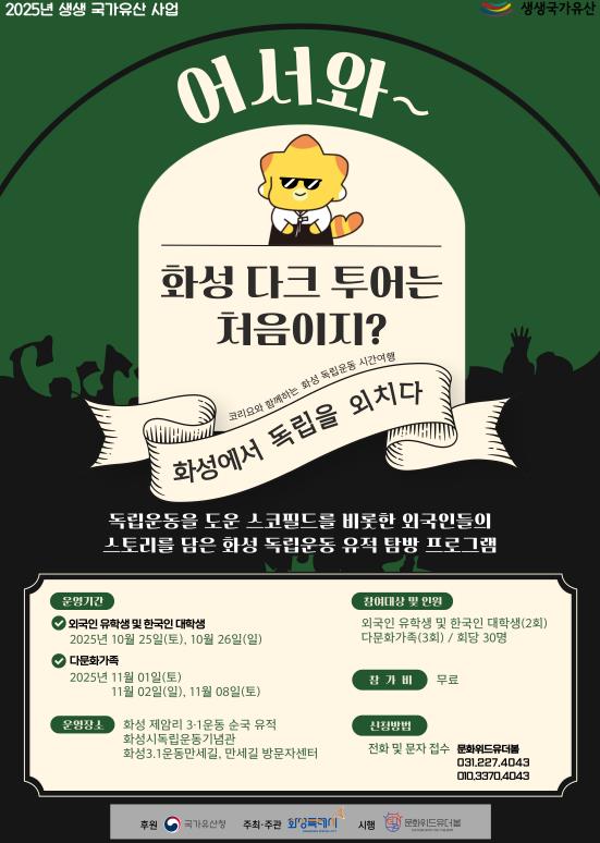 ‘어서와~ 화성 다크 투어는 처음이지?’는 외국인 유학생 및 한국인 대학생, 다문화가정을 대상으로 화성시독립운동기념관 및 화성 3.1운동만세길에서 오는 25일부터 3주간 총 5회차로 운영된다.