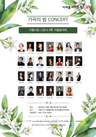 [메이저뉴스]고양특례시가 후원하고, (사)한국예술문화단체총연합회 고양지회가 주최하며 (사)한국음악협회 고양지부가 주관하는 ‘2025 가곡의 밤 – 아름다운 고양시 8경(景) 가을 음악회’가 오는 16일 오후 7시 30분, 고양아람누리 아람음악당에서 개최된다.