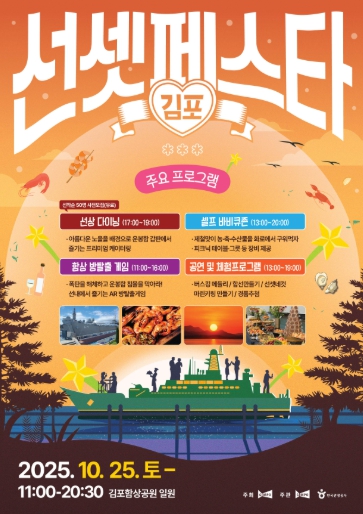 [메이저뉴스]아름다운 석양을 배경으로 선상 다이닝을 즐길 수 있는 특별한 축제가 김포에서 열린다. 오는 25일 단 하루, 토요일 오전 11시부터 밤 8시 30분까지 대곶면 김포함상공원 일원에서 ‘2025 김포 선셋 페스타 위드(with) 로컬푸드 다이닝’이 개최된다.
