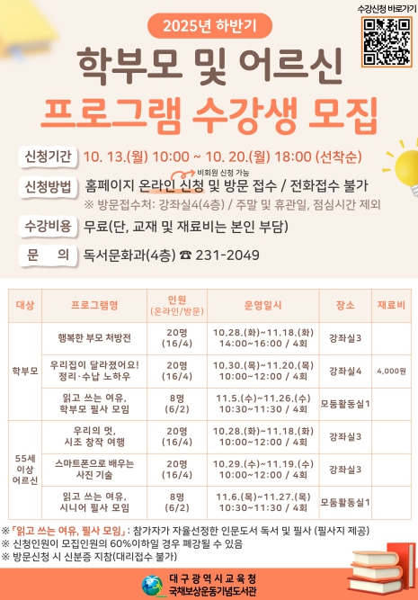 어르신 대상으로는 ▲시조를 이해하고 창작해 보는 ‘우리의 멋, 시조 창작 여행, 스마트폰 카메라 활용법’, ▲사진 편집 방법을 익힐 수 있는 ‘스마트폰으로 배우는 사진 기술’ 프로그램을 운영한다. 또한, ▲학부모 및 어르신 대상 자율 선정한 인문도서를 필사하는 ‘읽고 쓰는 여유, 필사 모임’을 진행한다.