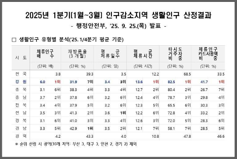 [메이저뉴스]강원특별자치도는 행정안전부가 9월 25일 발표한 ‘2025년 1분기 인구감소지역 생활인구 산정 결과’에서 체류인구 총 2,826,012명으로 전국 최고 수준을 기록했다고 밝혔다.