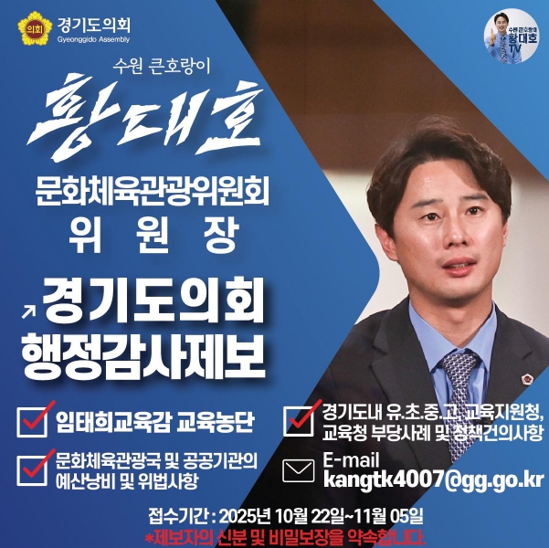[메이저뉴스]경기도의회 문화체육관광위원회 황대호 위원장(더불어민주당, 수원3)이 2025년도 행정사무감사를 앞두고 도민들을 대상으로 공개제보를 받는다고 SNS 등을 통해 알렸다.
