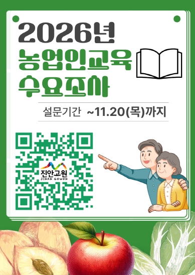 [메이저뉴스]진안군(군수 전춘성)은 2026년도 진안환경농업대학 및 농업인교육 과정 선정을 위해 10월 21일부터 11월 20일까지 한 달간 진안군민과 농업인의 다양한 의견을 반영하기 위한 ‘농업인 교육 수요조사’를 실시한다.