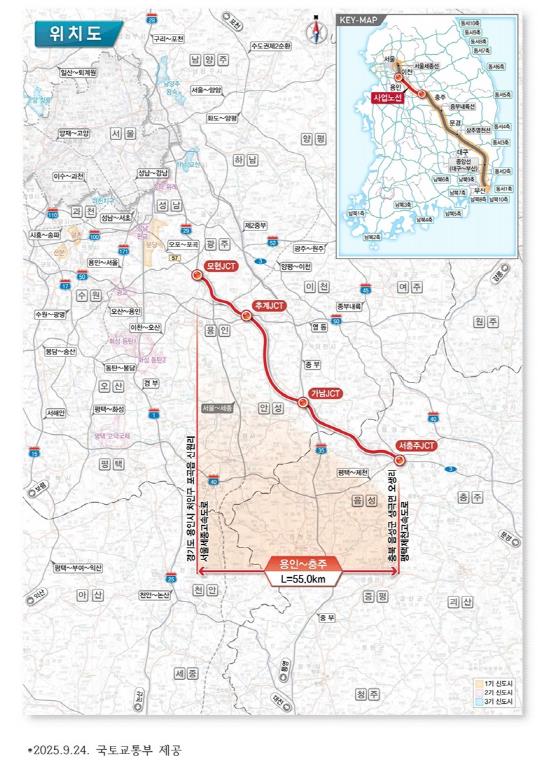 국토교통부에 따르면 안성과 용인-음성-충주를 연결하는 민자고속도로는 손익 공유형(BTO-a) 방식으로 추진되며, 총연장 약 55km, 왕복 4차로, 설계속도는 시속 110km