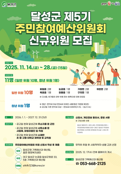 [메이저뉴스]달성군은 11월 14일부터 28일까지 제5기 주민참여예산위원회 신규위원 11명을 모집한다.