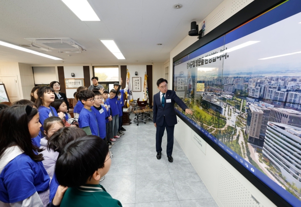 아이들은 구청장과 함께 화면 속 자료를 보며 “우리 동네에서 이런 일을 하고 있었어요?”라며 놀라워했고, 실제 행정이 지역 변화와 어떻게 연결되는지 직접 체감하는 시간을 가졌다.