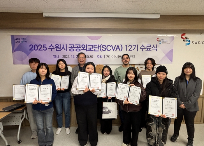 [메이저뉴스]수원시국제교류센터가 22일 센터에서 ‘수원시 공공외교단(SCVA) 12기’ 수료식을 열고, 단원 16명에게 수료증을 전달했다. 우수활동자 4명에게는 상장을 수여했다.