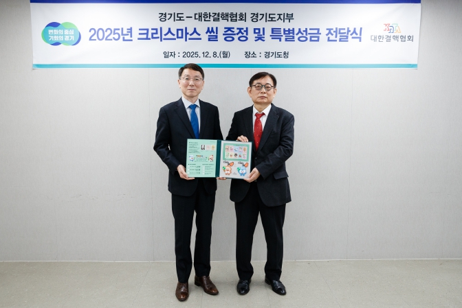 [메이저뉴스]김성중 경기도 행정1부지사는 8일 도청에서 김영준 대한결핵협회 경기도지부장으로부터 크리스마스 실(seal)을 증정받고 특별성금 200만 원을 전달했다. 전달식은 2025년 크리스마스 실 모금 캠페인의 취지를 함께하고 결핵퇴치기금을 마련하기 위해 이뤄졌다.