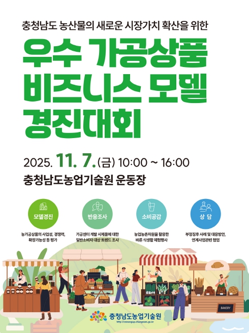 [메이저뉴스] 충남도 농업기술원은 오는 11월 7일 농가공경영체와 전문가, 일반 소비자 등 300여 명이 참석한 가운데 ‘2025년 우수 가공상품 비즈니스 모델 경진대회’를 개최한다고 30일 밝혔다.