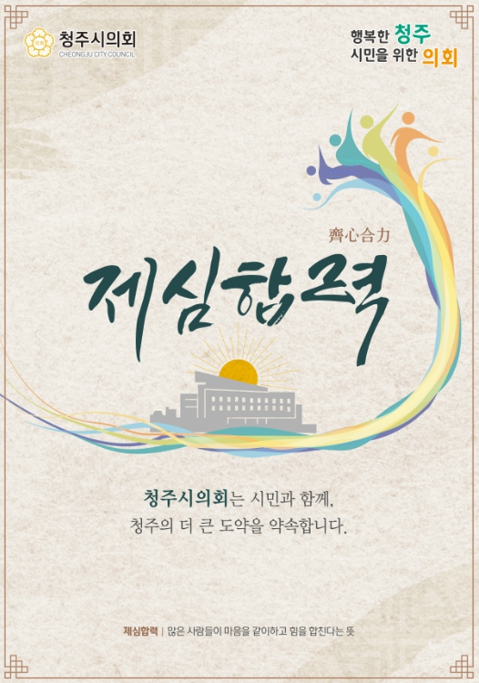 ‘제심합력’은 여러 사람이 마음을 같이하고 힘을 합친다는 뜻으로 변화와 도전의 시기를 맞은 지금 모두가 뜻을 모아 청주의 더 큰 도약을 이루겠다는 의미를 나타낸다.