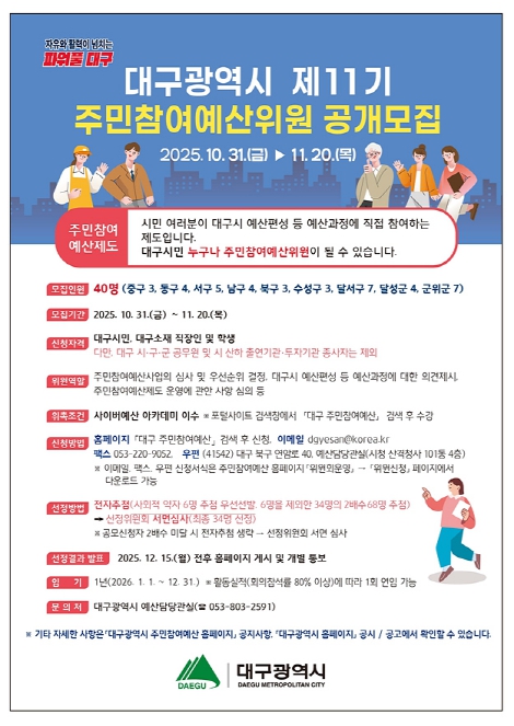 [메이저뉴스]대구광역시는 2026년 주민참여예산제 운영에 참여할 제11기 주민참여예산위원 40명을 공개 모집한다.