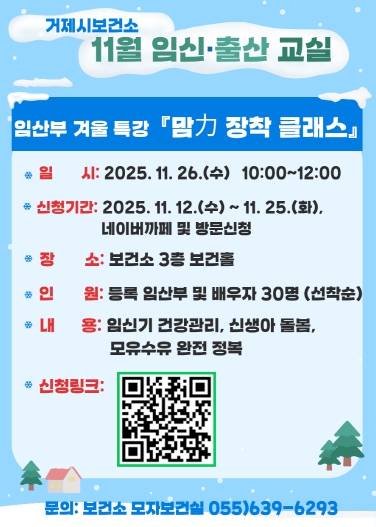 [메이저뉴스]거제시보건소는 오는 11월 26일 오전 10시부터 12시까지 보건소 3층 보건홀에서 '맘力 장착 클래스' 겨울 특강을 개최한다. 지역 내 임산부와 배우자를 대상으로 하며, 11월 12일부터 네이버 카페 또는 모자보건실 방문을 통해 신청할 수 있다.