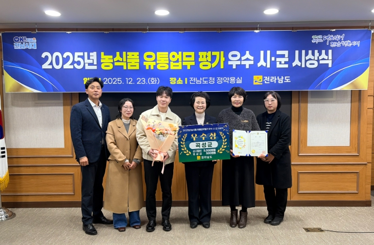 [메이저뉴스]곡성군수는 전라남도가 주관한 ‘2025년 농식품 유통업무 우수 시‧군 평가’에서‘우수상’을 수상했다고 23일 밝혔다. 군은 전년도에 동일 평가에서 ‘최우수상’을 받은 경력이 있으며, 이번 수상으로 농식품 유통업무 우수 지자체로서의 입지를 다졌다.