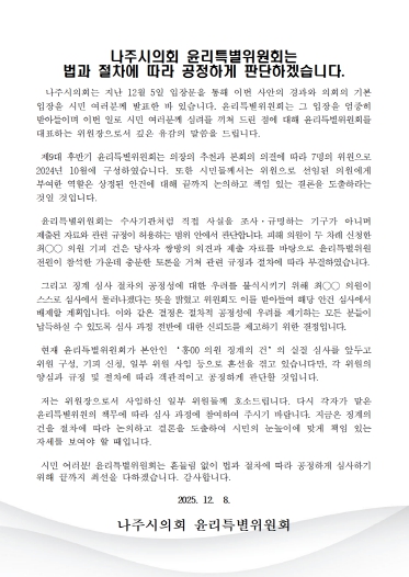 [메이저뉴스]나주시의회 윤리특별위원회(위원장 김정숙)는 12월 8일, 홍○○ 의원 징계의 건 관련한 심사 절차가 진행되는 가운데 위원 구성, 기피 신청, 일부 위원 사임 등으로 논란이 이어진 상황과 관련해 입장문을 발표하고 “법과 절차에 따라 공정하게 판단하겠다”고 밝혔다.