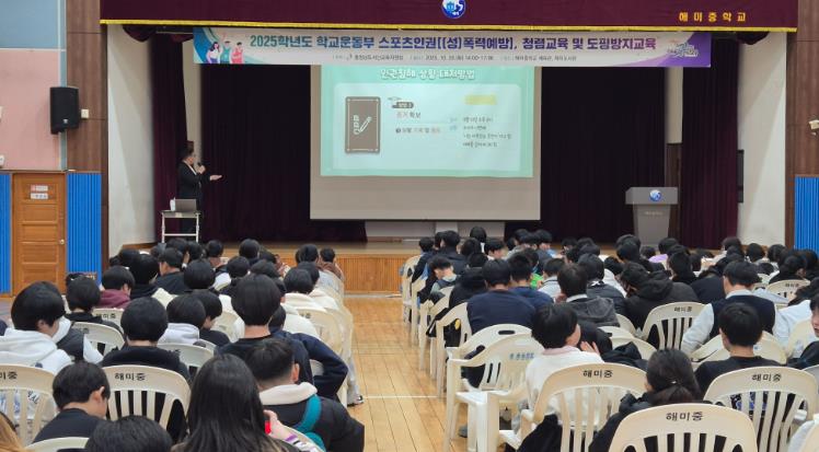 [메이저뉴스]충청남도서산교육지원청은 지난 28일, 해미중학교 체육관과 해미도서관에서 학생선수, 운동부 지도교사, 운동부 지도자, 전문스포츠지도자를 대상으로 한 '2025학년도 학교운동부 스포츠인권((성)폭력예방), 청렴교육 및 도핑방지교육'을 실시했다.