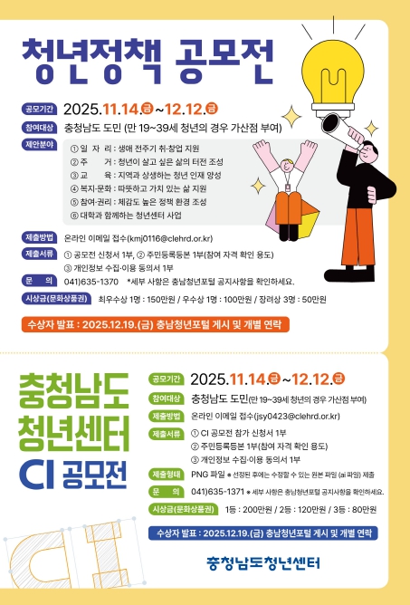 [메이저뉴스]충청남도 청년센터는 충청남도 청년의 창의적인 의견을 수렴하고 청년 정책 활성화를 도모하기 위해‘2025 충청남도 청년정책 공모전’과 ‘충청남도 청년센터 CI 공모전’을 지난 11월 14일부터 12월 12일까지 동시에 개최한다고 밝혔다.