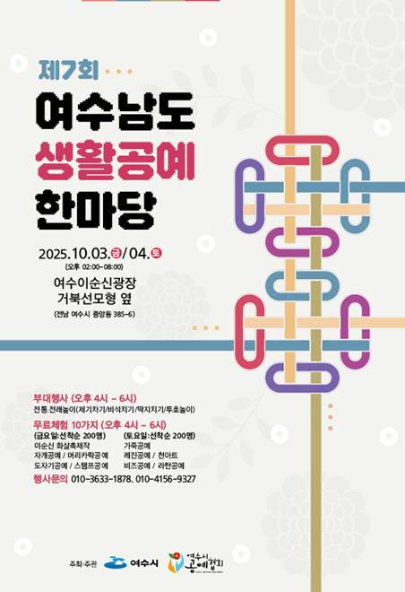 한편 여수 남도 생활공예 한마당은 생활 속 공예문화를 널리 알리기 위해 2019년부터 시작돼 매년 시민과 관광객의 발길을 모으는 지역 대표 공예 축제로 자리매김하고 있다.